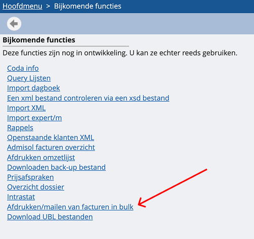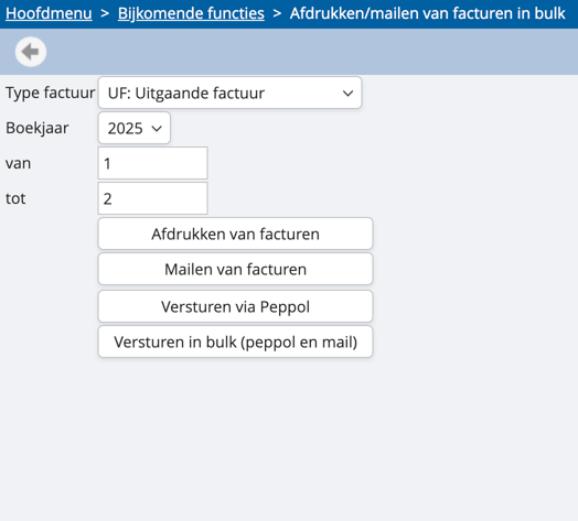 Je kan ook natuurlijk meerdere facturen gelijktijdig versturen via PEPPOL. In admisol kan je hiervoor de functionaliteit "Afdrukken/mailen van facturen in bulk gebruiken".