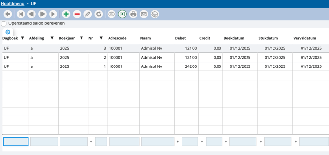 Een raster met alle eerder opgestelde verkoopfacturen verschijnt. Dit raster biedt de standaard functionaliteiten om te filteren, sorteren en exporteren.