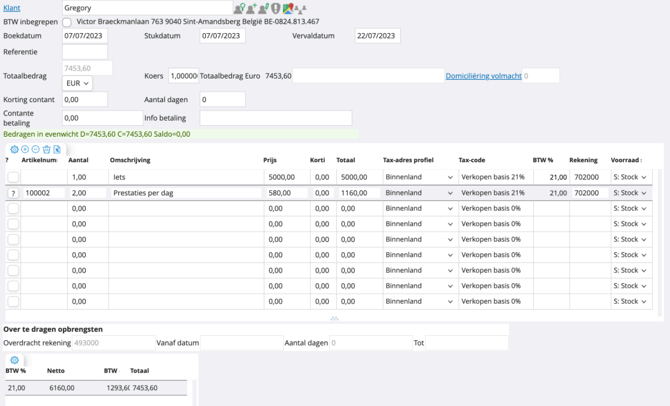 Het totaalbedrag van de regel wordt automatisch berekend. Als je dit bedrag rechtstreeks aanpast, wordt het aantal stuks automatisch herberekend. Indien gewenst kun je via de helpdesk vragen om dit gedrag te wijzigen, zodat in plaats daarvan de eenheidsprijs wordt aangepast. - Tax-adres profiel