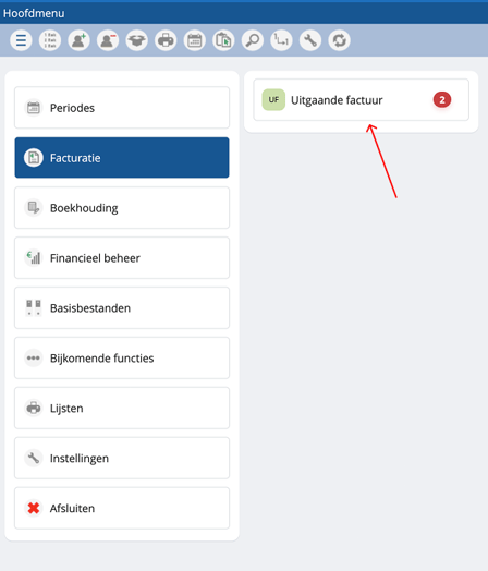 Om een nieuwe verkoopfactuur op te stellen, navigeer je vanuit het hoofdmenu via het linkermenu naar ‘facturatie’ en vervolgens rechts naar ‘uitgaande factuur’.