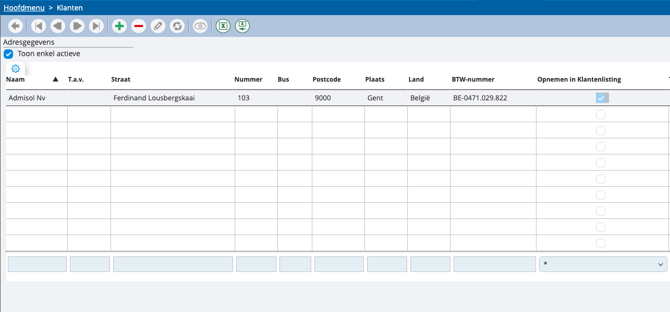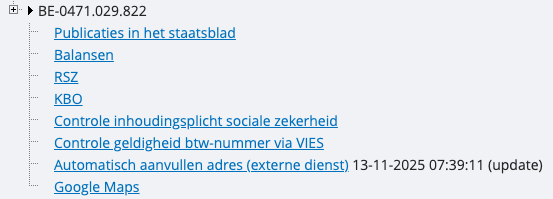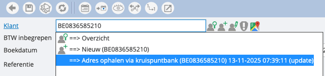 Het systeem heeft een koppeling met de Kruispuntbank, waardoor adresgegevens automatisch kunnen worden opgehaald bij het aanmaken van klanten- of leveranciersfiches. Je kunt dit op twee manieren gebruiken: