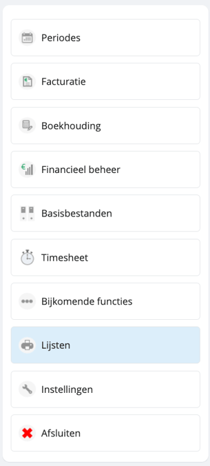 Om de BTW-klantenlisting aan te maken, navigeer je vanuit het hoofdmenu via het linkermenu naar 'Afdrukken/Lijsten'.