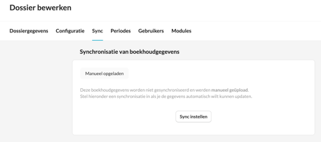 De synchronisatie opzetten voor dit dossier. Let op, dit dossier bevat al data! Dit scenario betekent dat deze data in de alle periodes overschreven wordt. Enkel de data wordt vervangen, de onderbouw, details, rapporten, .. blijven allen behouden.