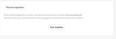 Een synchronisatie starten na de opgeladen manuele data. Je kiest hierbij zelf een datum waarbij de nieuwe synchronisatie van start gaat. Let op, dit dossier bevat al data! Dit scenario betekent dat deze data overschreven wordt voor alle periodes na deze datum! Enkel de data wordt vervangen, de onderbouw, details, rapporten, .. blijven allen behouden. - De data vervangen via automatische synchronisatie