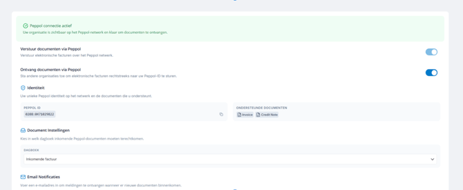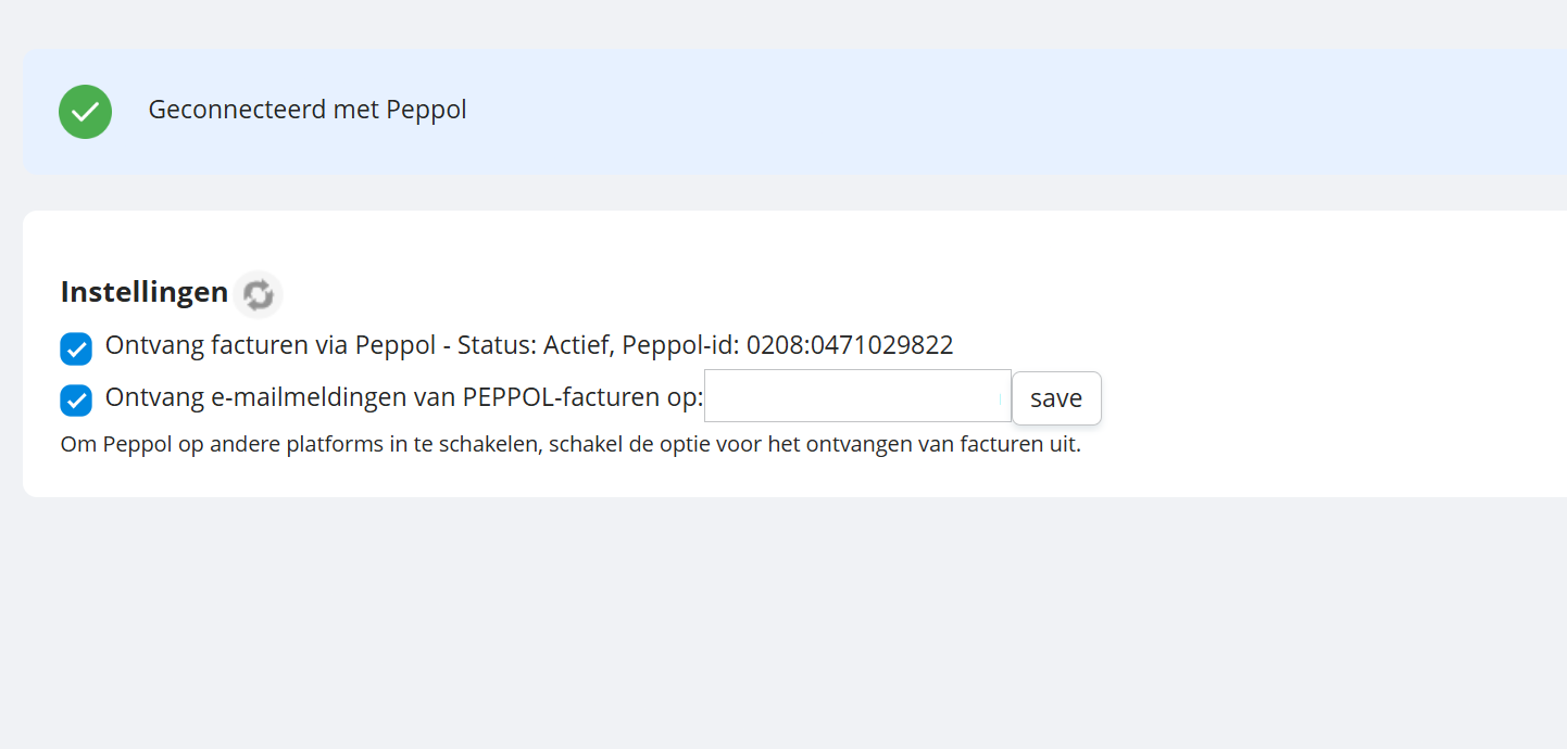 Als alles correct geactiveerd is, zie je in dit scherm dat je verbonden bent met Peppol en verschijnt ook jouw Peppol ID.
