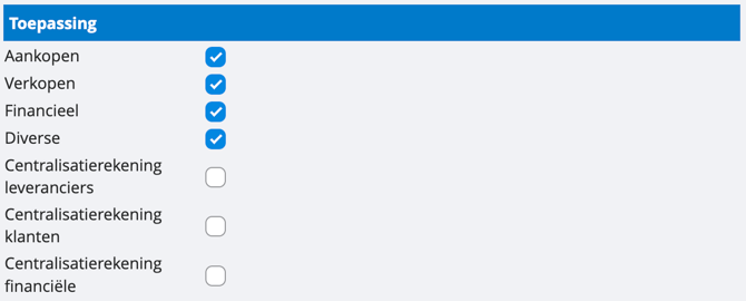 - Mag NIET samen met gewone rekeningen (Aankopen/Verkopen/Financieel/Diverse)