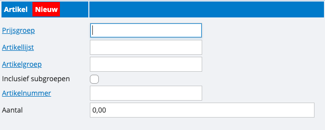 Het specifieke artikelnummer waarvoor deze prijsafspraak geldt. Laat dit leeg als de prijsafspraak voor een hele artikelgroep moet gelden. - Aantal